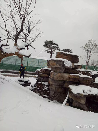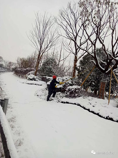 為確保新植苗木的安全,特別是造形樹不被積雪壓壞,承建申嘉湖高速湖州東互通區及申申高速連接線湖鹽公路段綠化提升工程的湖州中恒園林建設有限公司,26日一大早就派出施工人員,奔赴互通區現場,用竹竿拍除樹枝上的積雪,確保整個工程的綠化水準,提升湖州東大門的形象品質。