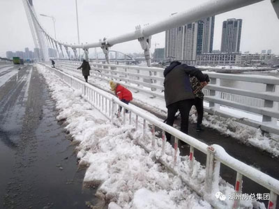 1月26日早晨,二環南路浮玉大橋、黃泥港大橋等路段均出現了道路積雪、結冰等現象,給交通安全帶來了極大的安全隱患。大雪無情人有情,我公司中心城市外環道路東南段建設項目部、前期工程部立即做出反應,安排抗凍防雪搶險小組奔赴現場,清掃道路積雪,并安排了融雪劑、防滑石子等搶險物資,以備不時之需。